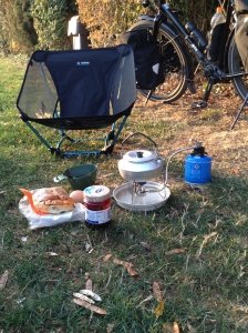 Afgelopen nacht prima geslapen in mijn nieuwe tent. Welliswaar even wennen aan het kleinere formaat en het feit dat ik lepeltje – lepeltje lig met mijn fietstassen. Weer eens iets anders en je moet alles een keer beleefd hebben.