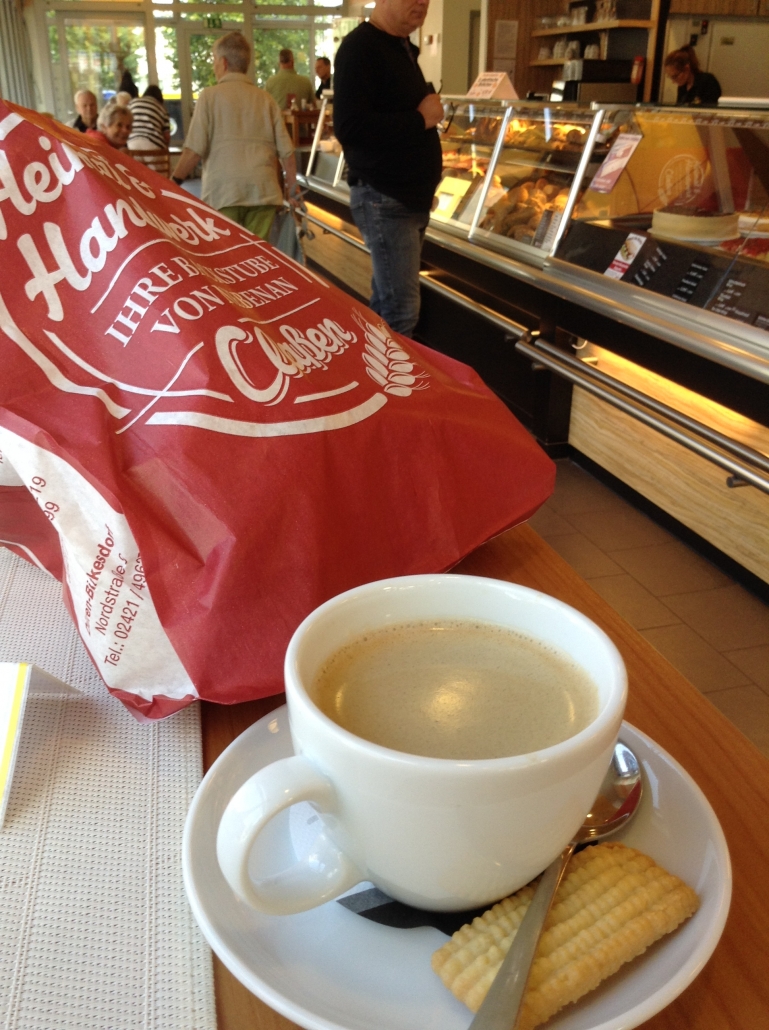 Ik ga vandaag proberen op het routeboekje mijn weg naar Remagen te vinden. Zoals eerder geschreven is mijn navigatie weigerachtig. Bij de eerst konditorei koop ik frische Brötchen en een echt kop koffie, vraag nog even of ik op de juiste route zit en dat blijkt te kloppen. Gisteren had ik moeite om de route precies volgens het boekje te vinden, maar dat lag aan mijn niet nauwkeurig genoeg lezen en opletten. Vandaag gaat het een stuk beter en dat doet me goed, het voelt als een overwinning en bevestiging dat ik het ook zonder navigatie kan.