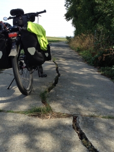 De route buigt af en ik zeg Auf Wienerschnitzel tegen de Rijn. Het is eerst nog dampig weer, maar al snel begint de zon volop te schijnen en het zal een prachtige dag worden. Het landschap is afwisselend met af en toe een stadje of dorpje en ik fiets over mooie stille landweggetjes. Af en toe is het opletten geblazen door enorme scheuren in het betonnen pad.