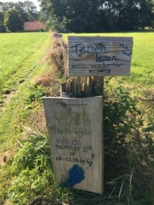 Net als ik denk dat dit toch echt fout is, zie ik een tweetal houten plankjes die aan een weidepaal getimmerd zijn. Op het bovenste staat met viltstift geschreven: “Nu ook tenen lezen, inzicht in je karakter en gedrag”.